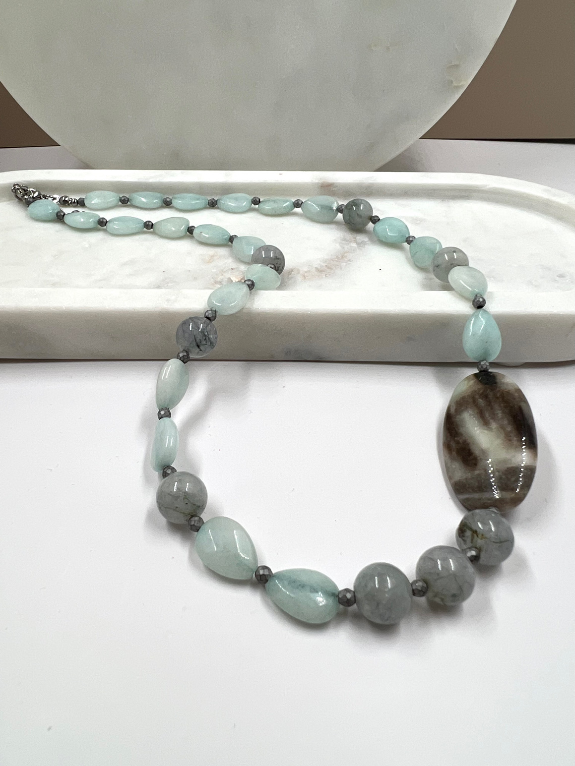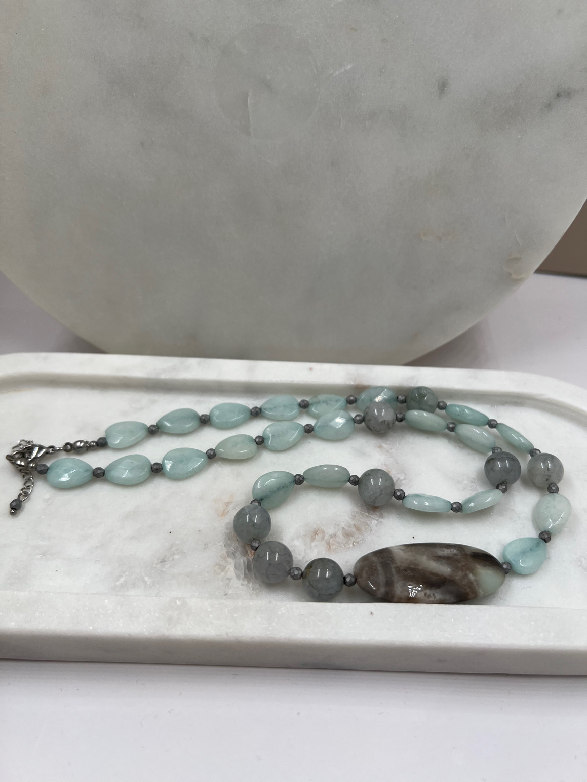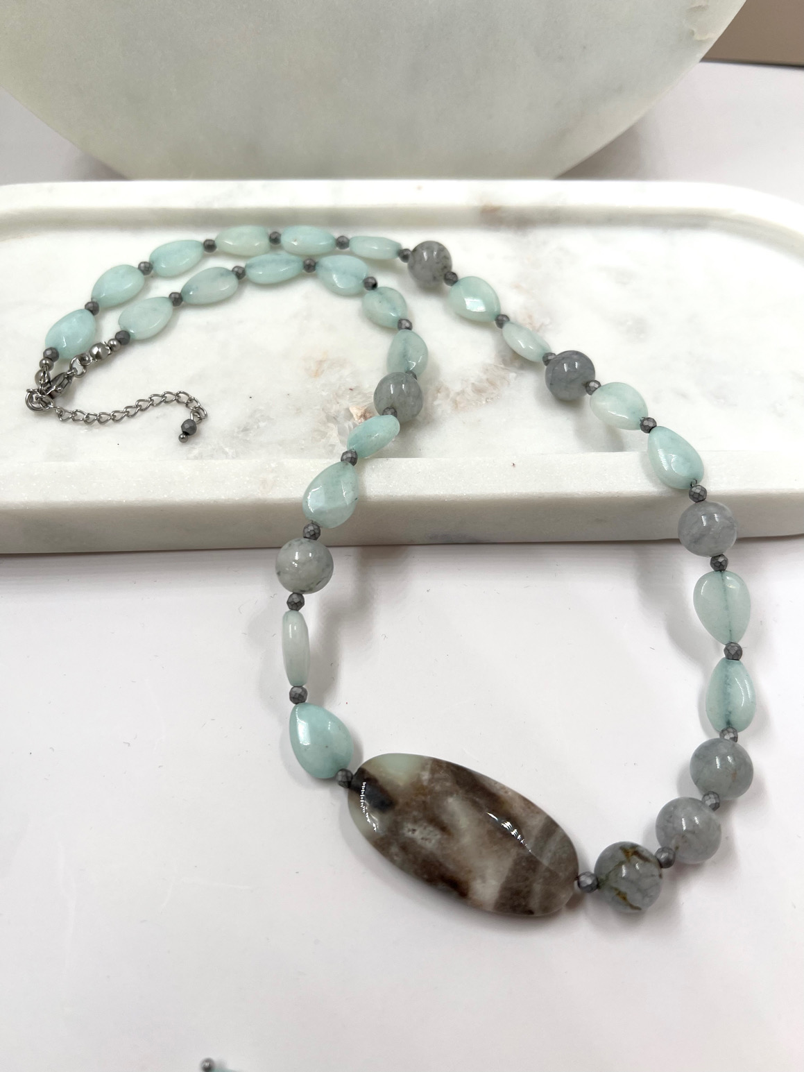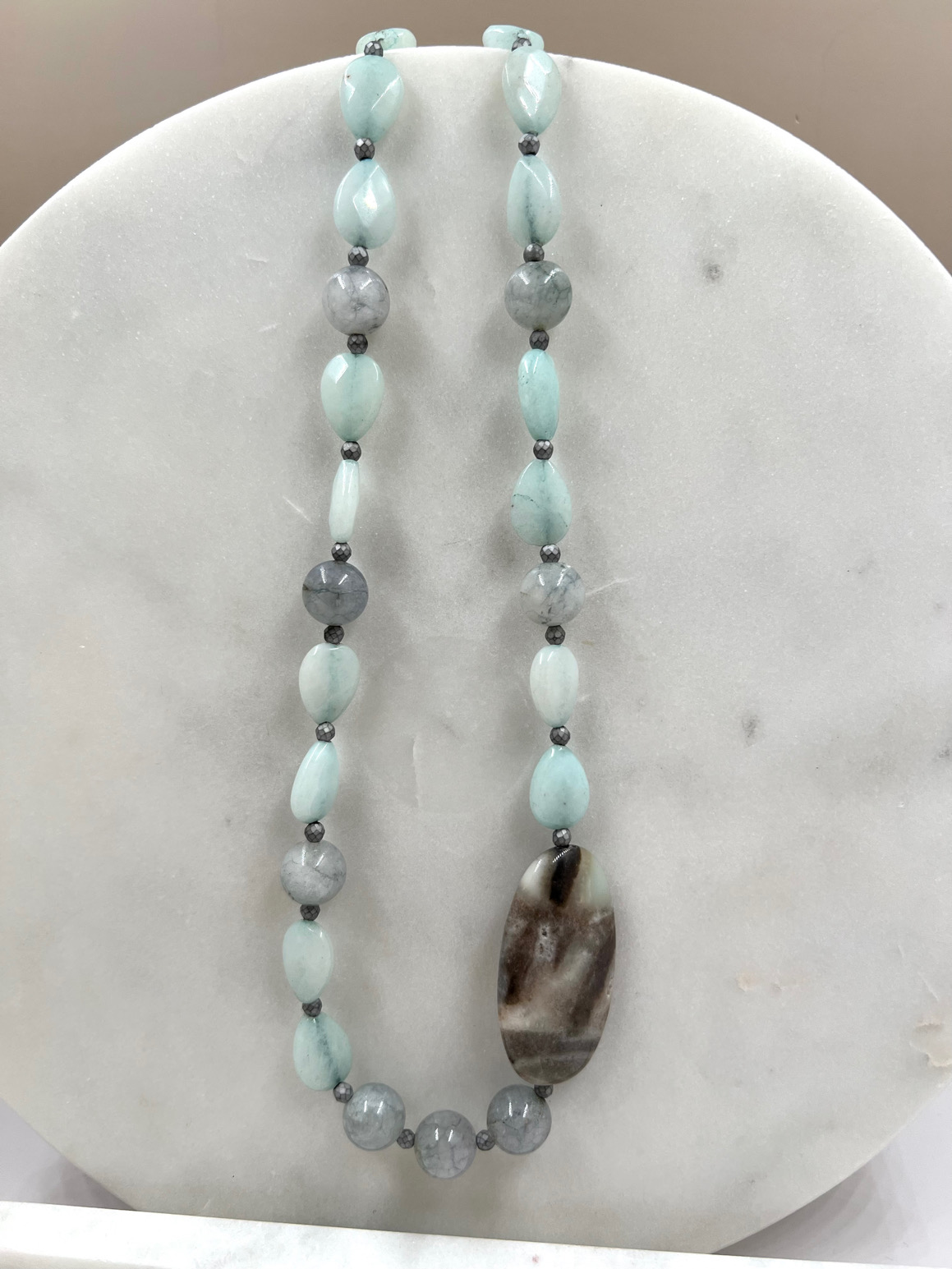Unikatna ogrlica od žada, angelita, amazonita i hematita 440